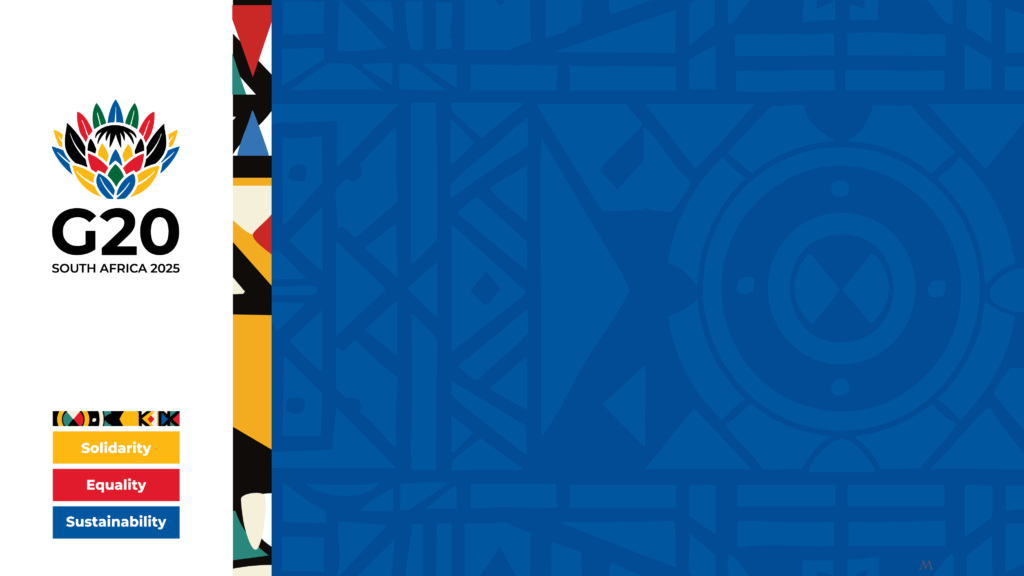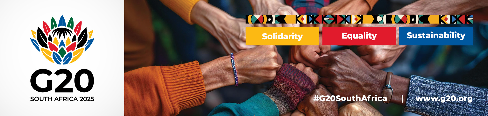 The G20 South Africa logo/brand is the property of the Department of International Relations and Cooperation (DIRCO). The logo/brand should not be utilised for fraudulent or unauthorised transactions. The G20 South Africa logo/branding has considerable legal protection arising from various Acts of Parliament, and international agreements and protocols.